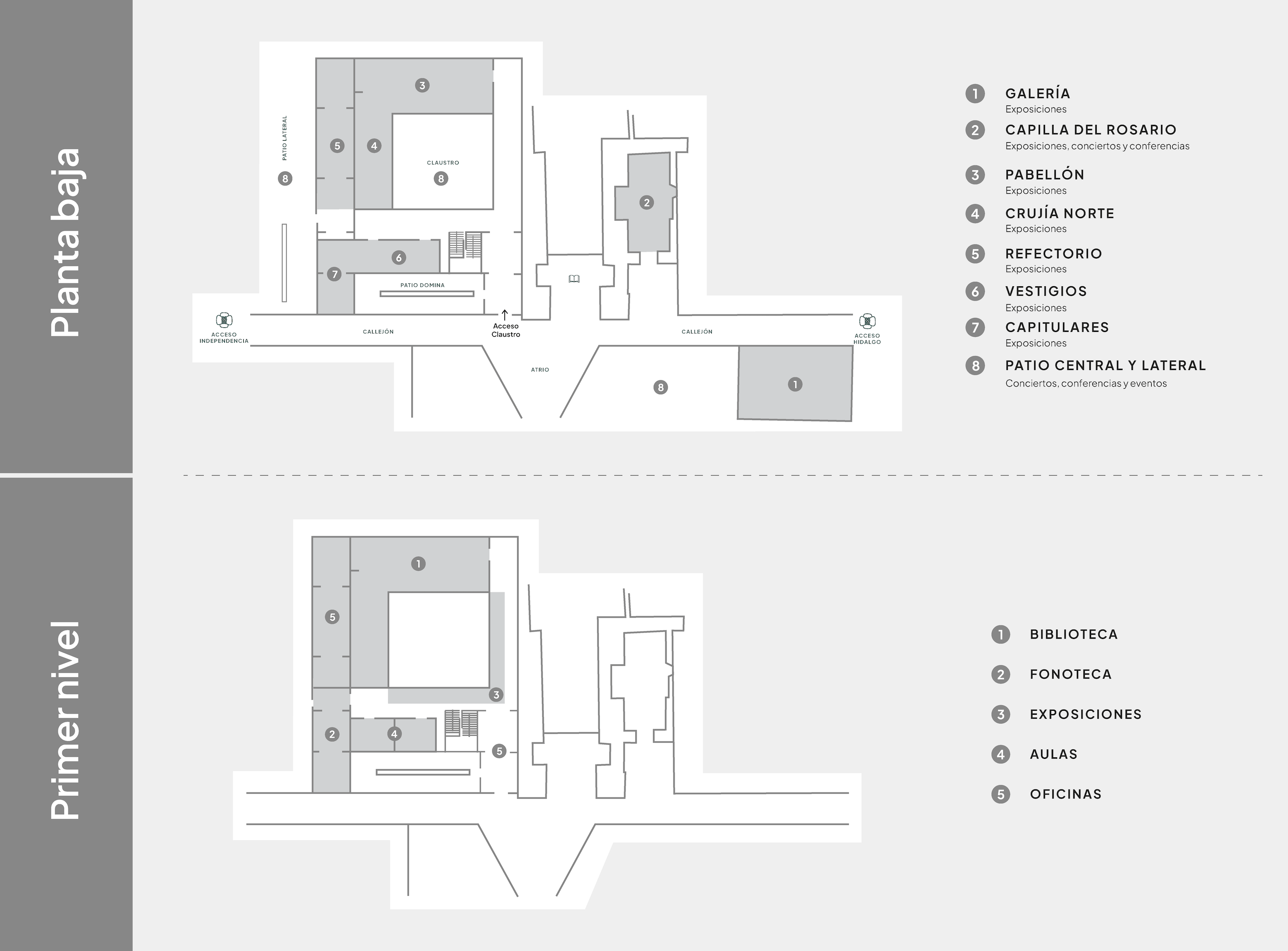 Los diferentes espacios que constituyen al Centro Cultural San Pablo son el escenario de exposiciones, conciertos, congresos, foros, conferencias, seminarios, cursos y talleres, que permiten a los visitantes recorrer el exconvento casi en su totalidad para darle una nueva vida. La mayoría de los títulos dados a estas áreas se corresponden con la función que cumplieron cuando San Pablo era un convento, no obstante el alejamiento de sus funciones originarias, estos espacios siguen recreando ambientes propicios para la contemplación y la reflexión: Galería, Capilla del Rosario, Pabellón, Crujía Norte, Refectorio, Vestigios y Capitulares